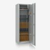 - Diese Modellreihe bietet standardmäßig einen Innentresor 180, 215 oder 350 mm hoch (die Höhe hängt von dem Modell ab) mit Zylinderschloss (2 Schlüssel) sowie einen Putzstockhalter auf der Türinnseite. Die Besonderheit bei dieser Modellreihe sind einhängbare Waffenhalter (im 2er bzw. 3er Set) welche im 50 mm Raster ab 600 mm bis 1000 mm Höhe verstellbar sind.
