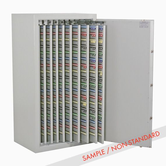 Schlüsselschrank mit voll ausziehbaren, auf Teleskopschienen laufenden Zwischenwänden zur Organisation und sicheren Aufbewahrung von besonders vielen Schlüsseln.
