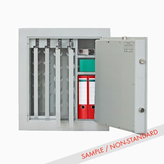 Schlüsselschrank mit voll ausziehbaren, auf Teleskopschienen laufenden Zwischenwänden zur Organisation und sicheren Aufbewahrung von besonders vielen Schlüsseln.