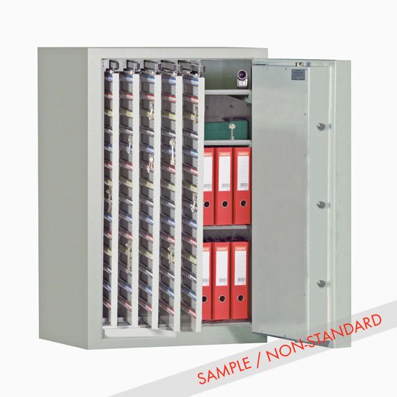 Schlüsseltresor mit voll ausziehbaren, auf Teleskopschienen laufenden Zwischenwänden zur Organisation und hochsicheren Aufbewahrung von besonders vielen Schlüsseln.