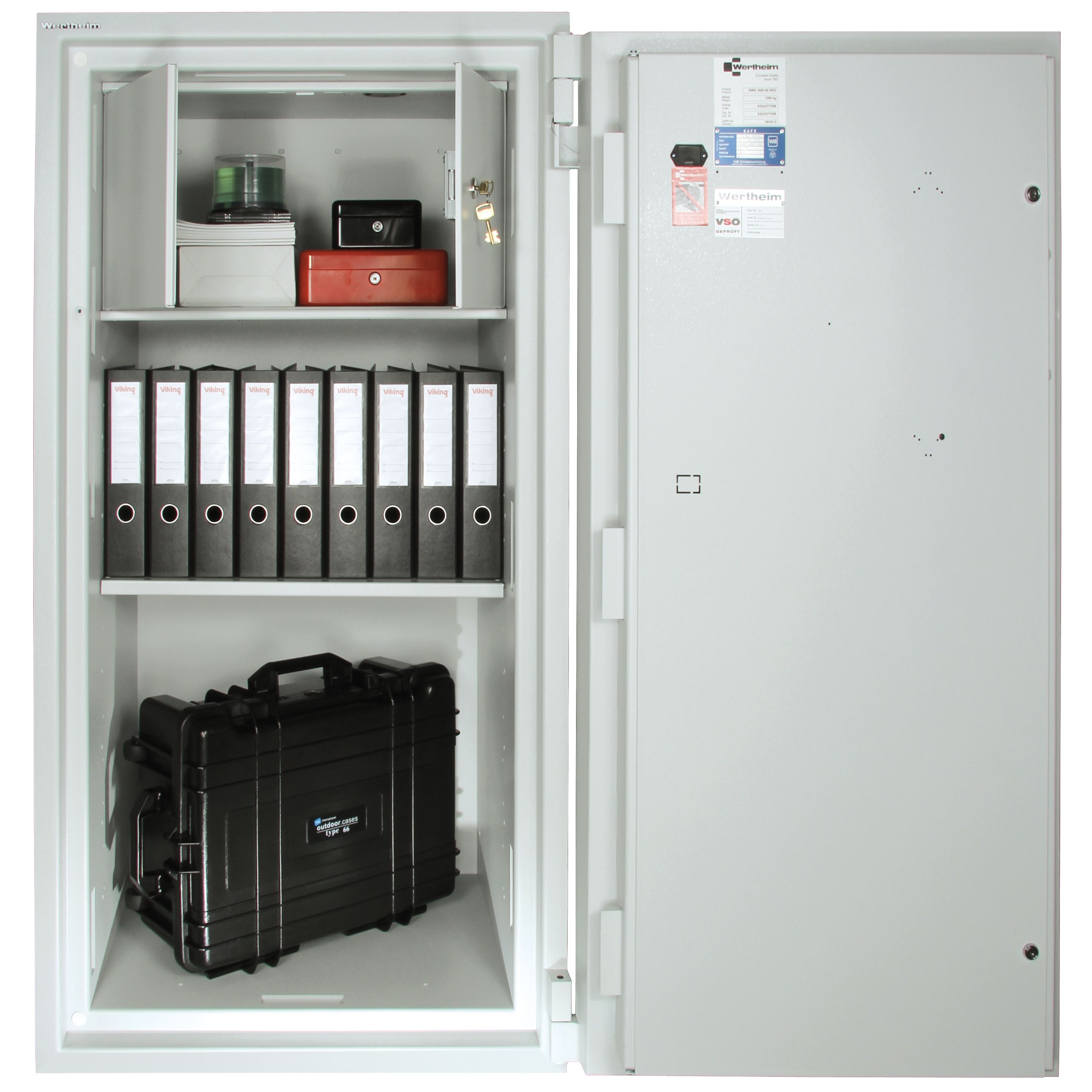 - Serienmäßig mit zwei Doppelbart-Sicherheitsschlössern der VdS-Klasse II (je zwei 2 Schlüssel) ausgestattet.