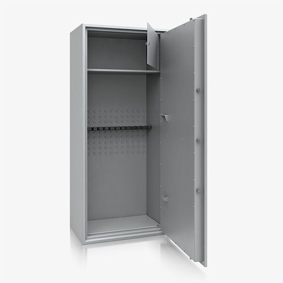 - Diese Modellreihe bietet standardmäßig einen Innentresor 180, 215 oder 350 mm hoch (die Höhe hängt von dem Modell ab) mit Zylinderschloss (2 Schlüssel) sowie einen Putzstockhalter auf der Türinnseite. Die Besonderheit bei dieser Modellreihe sind einhängbare Waffenhalter (im 2er bzw. 3er Set) welche im 50 mm Raster ab 600 mm bis 1000 mm Höhe verstellbar sind.