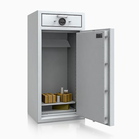 - Die gepanzerte Schublade ist 200 mm hoch und mit Beton gefüllt. Teleskopschienen erleichtern das Öffnen und Schließen. Beim Schließen der Schublade fällt der eigeworfene Gegenstand (z.B. Geldtasche etc.) in den Tresor.