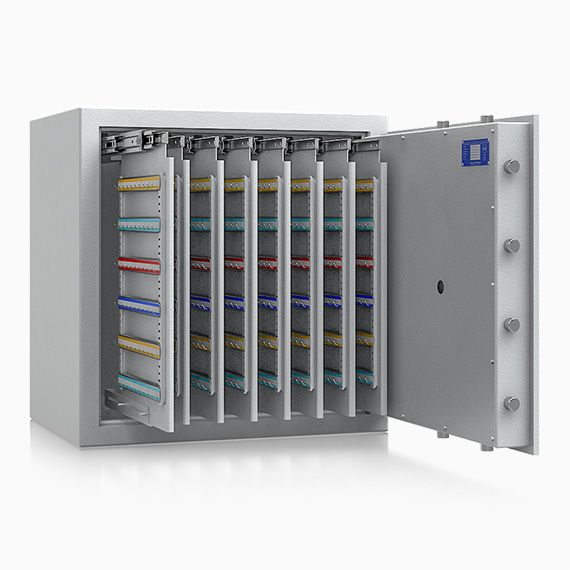 Schlüsseltresor mit voll ausziehbaren, auf Teleskopschienen laufenden Zwischenwänden zur Organisation und hochsicheren Aufbewahrung von besonders vielen Schlüsseln.
