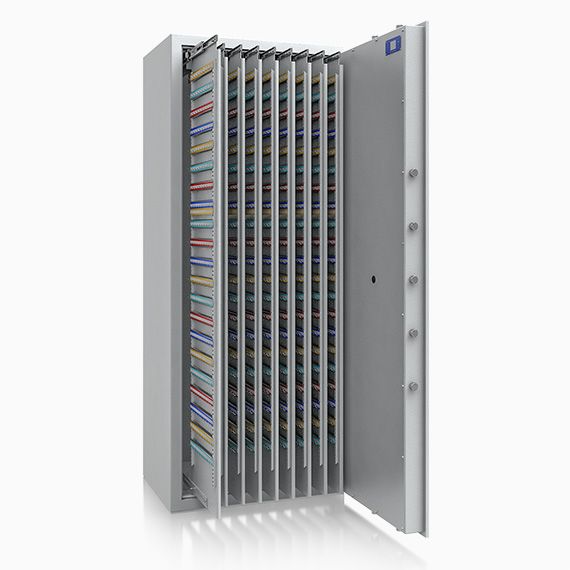 Schlüsseltresor mit voll ausziehbaren, auf Teleskopschienen laufenden Zwischenwänden zur Organisation und hochsicheren Aufbewahrung von besonders vielen Schlüsseln.