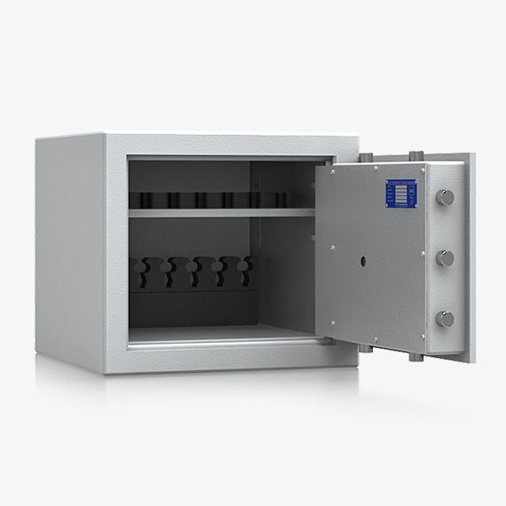 Kurzwaffentresor zur Lagerung von unbegrenzt vielen Kurzwaffen und Munition. Die Besonderheit bei dieser Modellreihe sind Verschwindscharniere und versenkte Beschläge (Griff + Schloss).