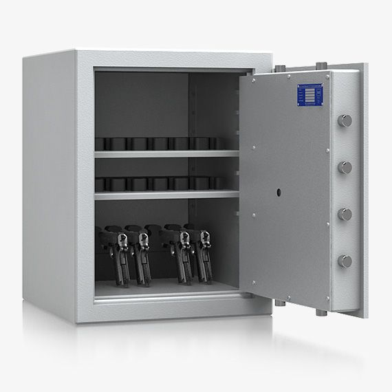 Kurzwaffentresor zur Lagerung von unbegrenzt vielen Kurzwaffen und Munition. Die Besonderheit bei dieser Modellreihe sind Verschwindscharniere und versenkte Beschläge (Griff + Schloss).
