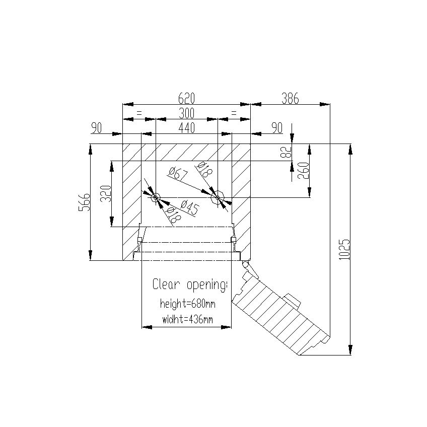 • Vorbereitet zur Montage am Boden mit einer Bohrung und einer Bohrung in der Rückwand (nicht durchgebohrt).
