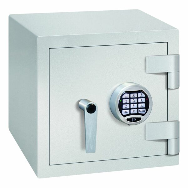 - Durch Füllung mit patentiertem speziellen Ultra-Hochleistungsbeton ist eine hohe Einbruchsicherheit bei vergleichsweise geringem Gewicht gegeben. Zusätzlich ist in Kombination mit dem vierseitig umlaufenden Feuerfalz ist ein hoher Feuerschutz gegeben. Darin aufbewahrte Dokumente, Akten, Geld etc. sind optimal vor Bränden und Löschwasser geschützt.
