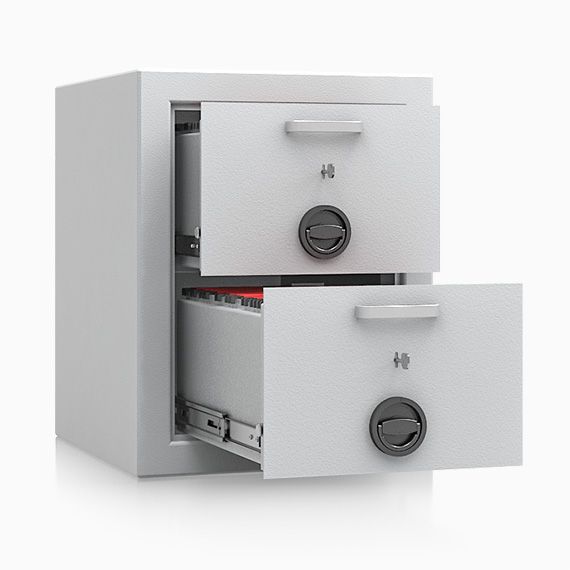 - Serienmäßig ist jede Schublade Doppelbart-Sicherheitsschloss VdS Klasse I (2 Schlüssel, Länge 65 mm) ausgestattet.