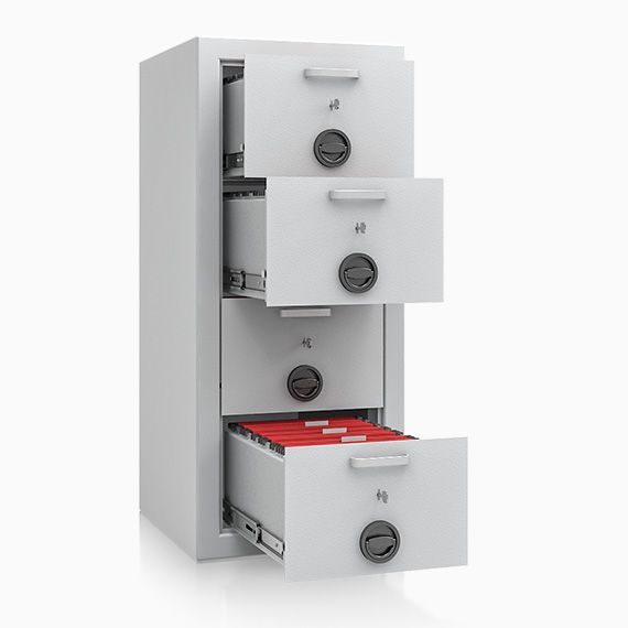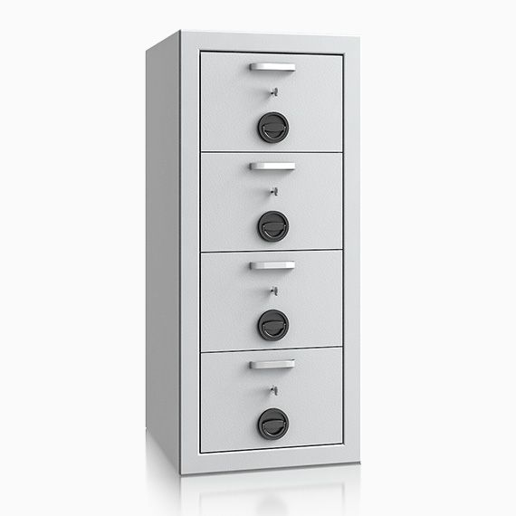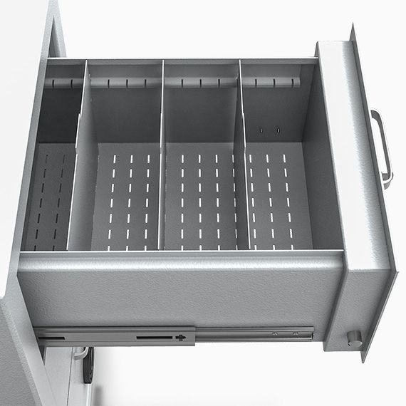 - Serienmäßig ist jede Schublade Doppelbart-Sicherheitsschloss VdS Klasse I (2 Schlüssel, Länge 65 mm) ausgestattet.