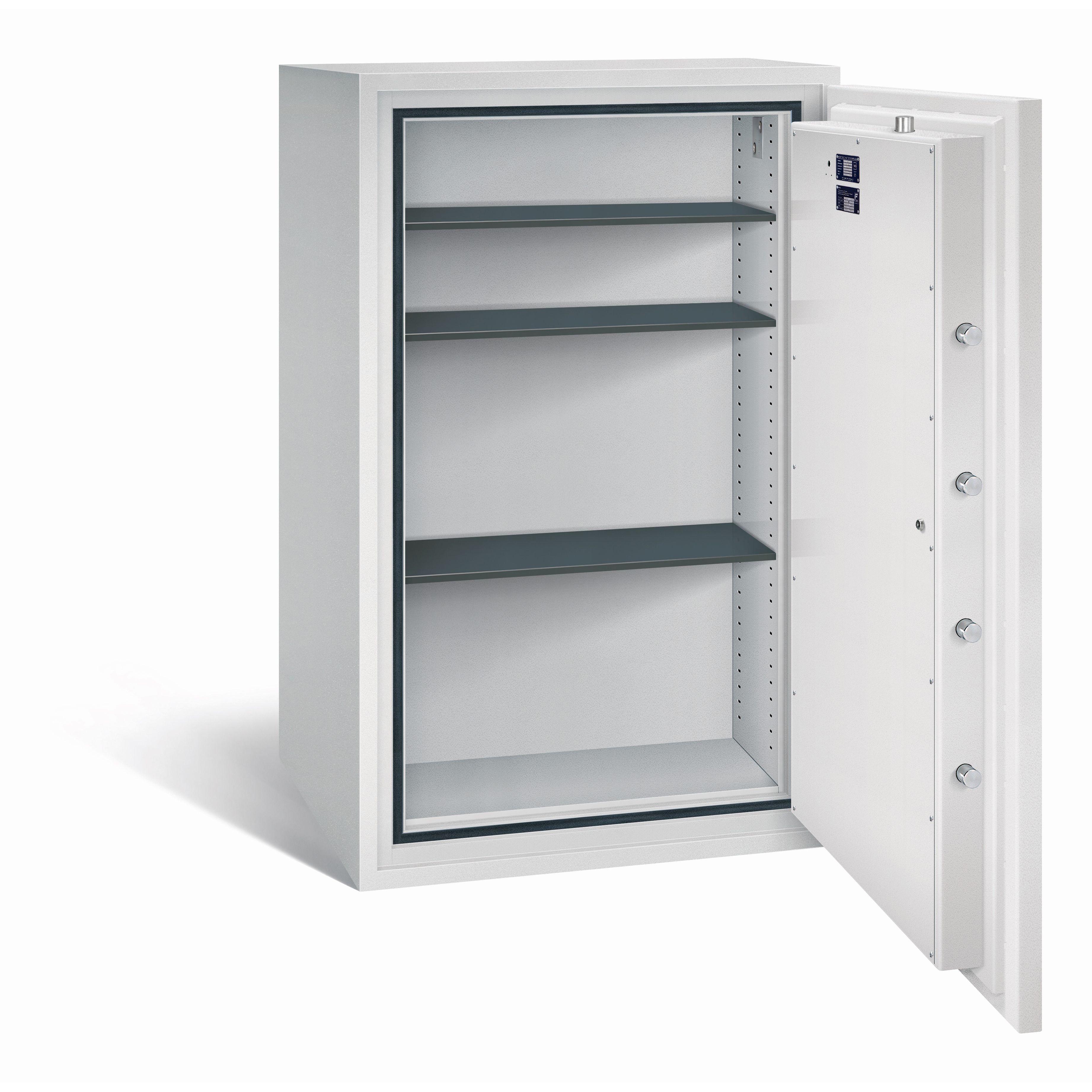 - Serienmäßig ist der Tresor mit zwei Doppelbart-Sicherheitsschlössern (je 2 Schlüssel) ausgestattet.