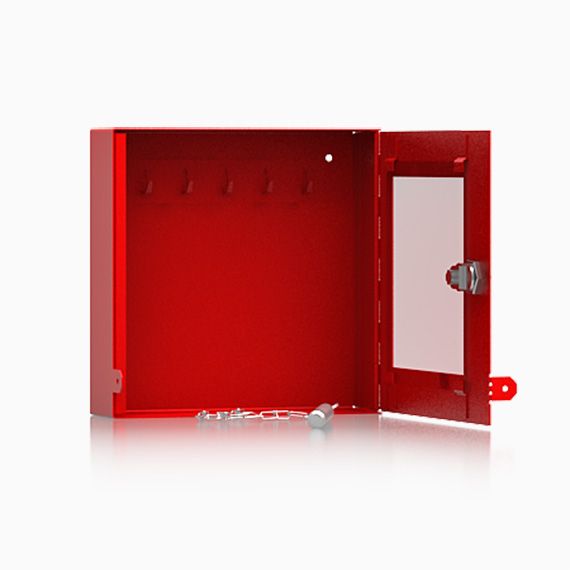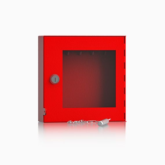 Notschlüsselkasten aus Stahlblech mit auswechselbarer Glasscheibe.