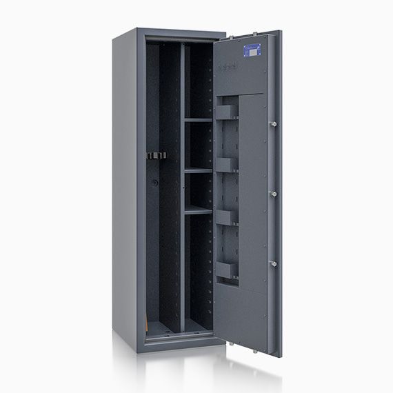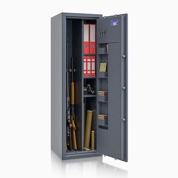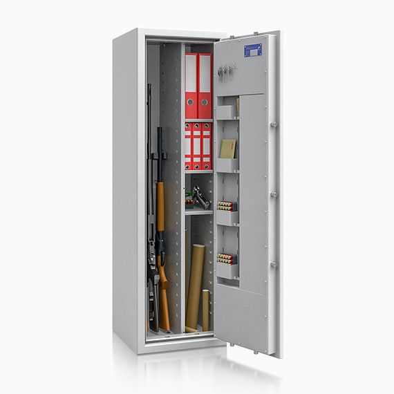 • Diese Modellreihe bietet standardmäßig eine Trennwand, höhenverstellbare Fachböden auf die komplette Nutzhöhe, 1 Reihe Waffenhaltern (Schaumstoffwaffenhalter) und Staufächer auf der Türinnenseite (durch eine Neukonstruktion der Türverkleidungsplatte – Innenraum wird nicht beeinträchtigt) viel Platz um den Innenraum nach individuellen Bedürfnissen zu gestalten. Zusätzlich ist der Tresor mit einem Putzstockhalter und Hakenleisten für z.B. Schlüssel auf der Türinnseite ausgestattet.