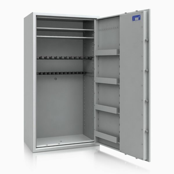 - Diese Modellreihe bietet mit höhenverstellbaren Fachböden auf die komplette Nutzhöhe, 2 Reihen von Waffenhaltern (Schaumstoffwaffenhalter auf verstellbaren Schienen in zwei Größen – 55 und 65 mm) und Staufächer auf der Türinnenseite (durch eine Neukonstruktion der Türverkleidungsplatte – Innenraum wird nicht beeinträchtigt) viel Platz um den Innenraum nach individuellen Bedürfnissen zu gestalten. Zusätzlich ist der Tresor mit einem Putzstockhalter und Hakenleisten für z.B. Schlüssel ausgestattet.