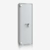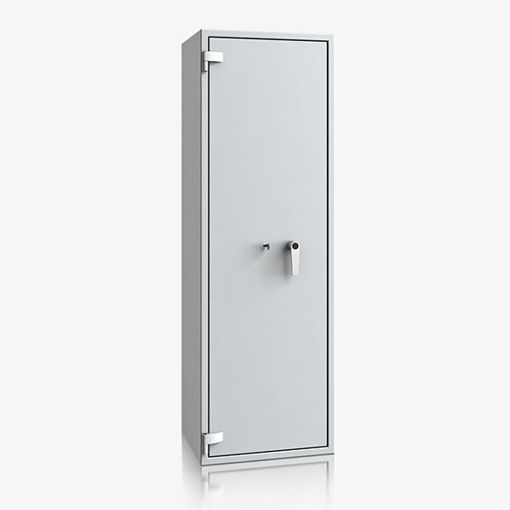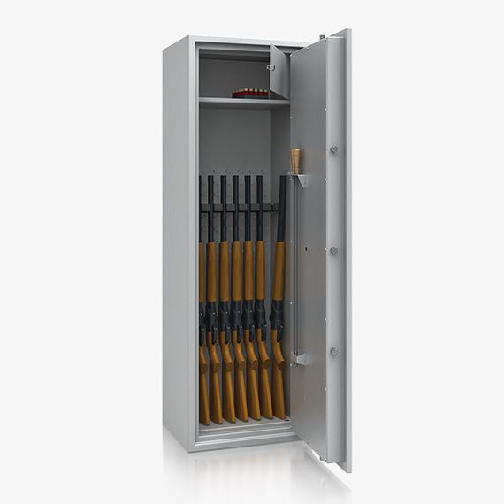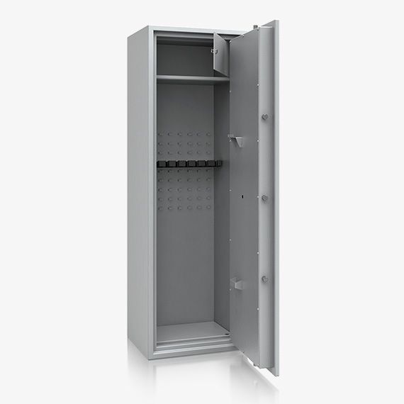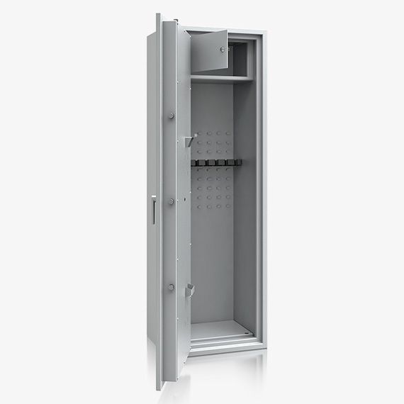 - Diese Modellreihe bietet standardmäßig einen Innentresor 180, 215 oder 350 mm hoch (die Höhe hängt von dem Modell ab) mit Zylinderschloss (2 Schlüssel) sowie einen Putzstockhalter auf der Türinnseite. Die Besonderheit bei dieser Modellreihe sind einhängbare Waffenhalter (im 2er bzw. 3er Set) welche im 50 mm Raster ab 600 mm bis 1000 mm Höhe verstellbar sind.