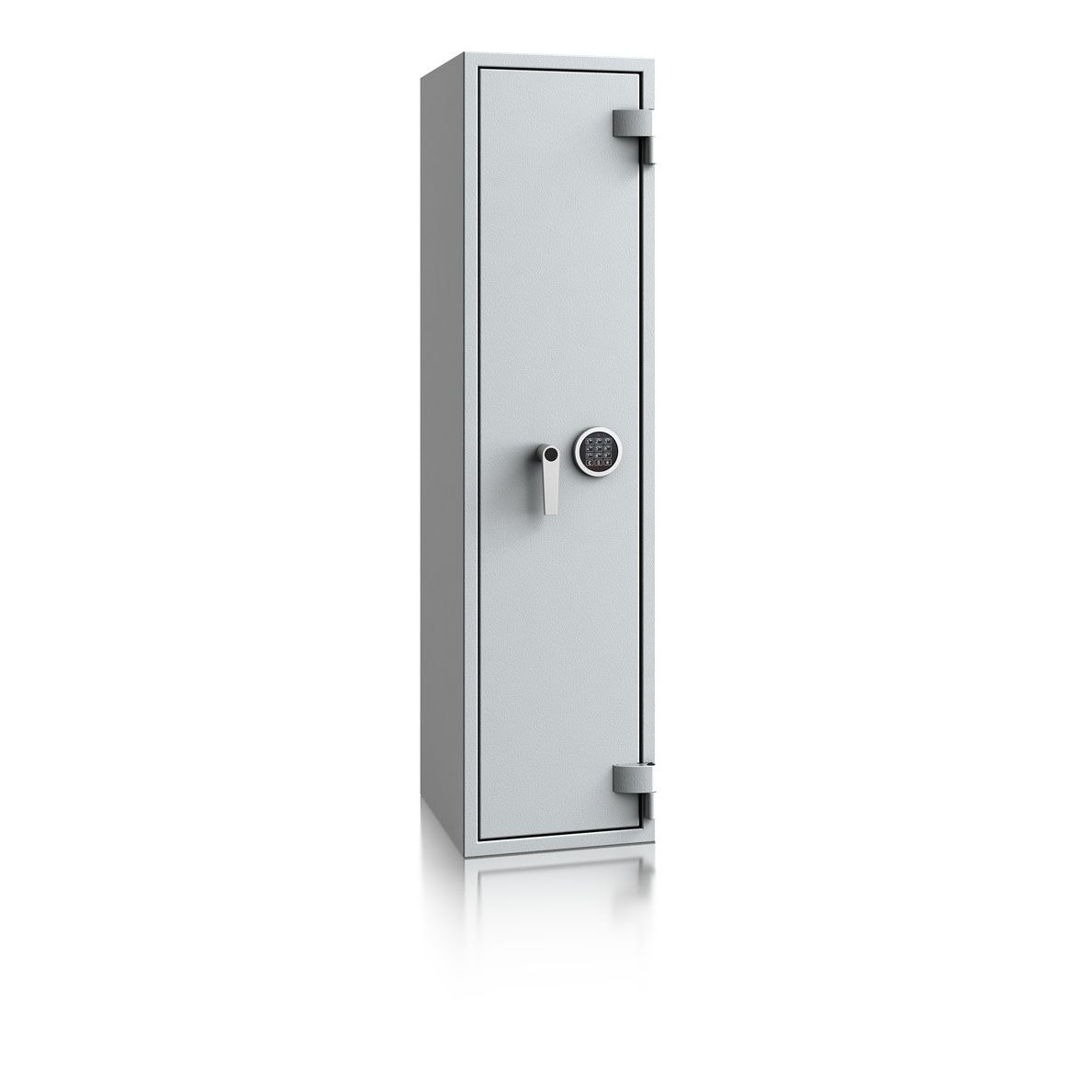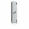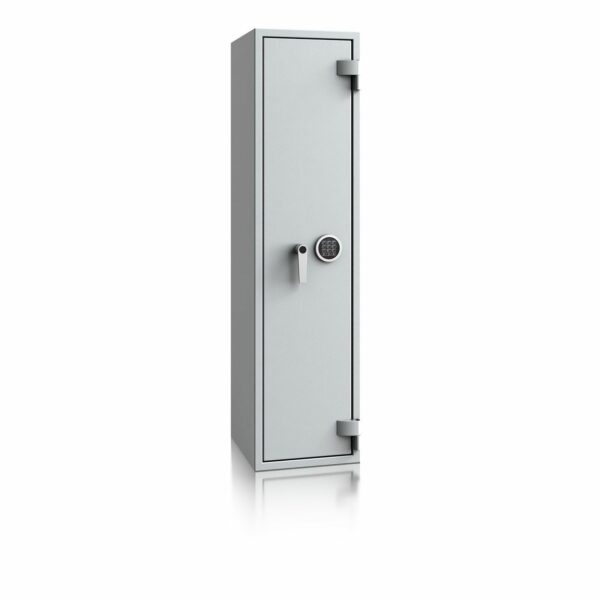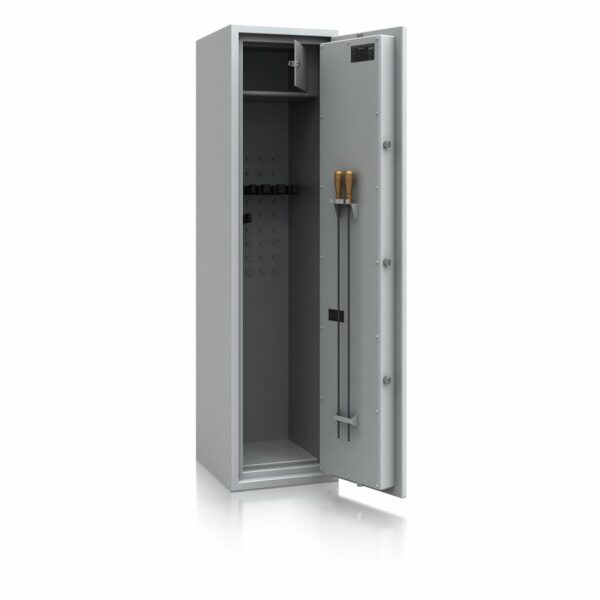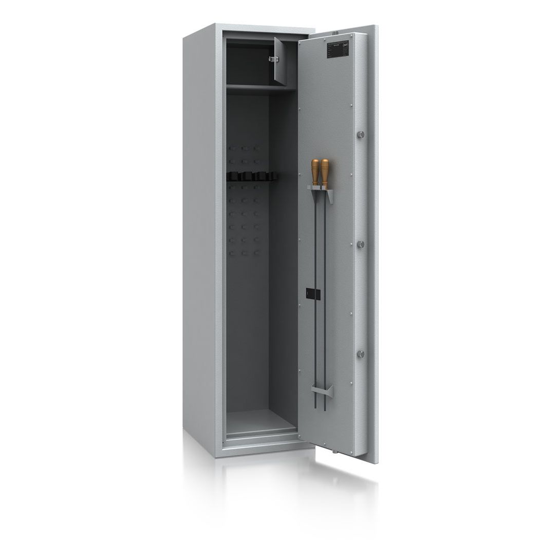 - Diese Modellreihe bietet standardmäßig einen Innentresor 180, 215 oder 350 mm hoch (die Höhe hängt von dem Modell ab) mit Zylinderschloss (2 Schlüssel) sowie einen Putzstockhalter auf der Türinnseite. Die Besonderheit bei dieser Modellreihe sind einhängbare Waffenhalter (im 2er bzw. 3er Set) welche im 50 mm Raster ab 600 mm bis 1000 mm Höhe verstellbar sind.