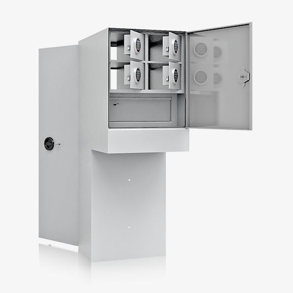 - Im Innengebäude wird ein Auffangtresor an der Außenwand installiert. Dieser Safe ist mit einem aufgesetzten Einwurfsystem und einem Annahme- und Ausgabe-Fach ausgestattet. Einwurf- und Ausgabesystem stehen zur Rückseite des Safes über und werden in die Wandöffnung eingemauert. Der Schacht der von außen zugänglichen Einwurfklappe wird über ein Doppelbartsicherheitsschloss (2 Schlüssel) gesperrt (ohne DB-Schloss nur bauartähnlich S 1) und die Tür des Ausgabe- und Annahmefaches ist mit einem Hochsicherheits-Elektronikschloss ausgestattet. Davor befindet sich noch eine zusätzliche Tür aus Edelstahl die Einwurfklappe und Annahme- und Ausgabe-Fach abdeckt (1. aus Witterungsgründen, da Edelstahl nicht rostet und 2. aus Sicherheitsgründen um Vandalismus usw. zu vermeiden). Diese Abdecktür ist standardmäßig mit einem Haltemagnet ausgestattet und kann gegen Aufpreis mit einem Kofferzahlenschloss ausgerüstet werden. Die Haupttür ist serienmäßig mit einem Doppelbart-Sicherheitsschloss (2 Schlüssel) ausgestattet.