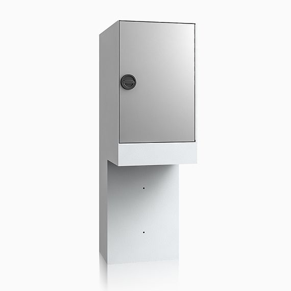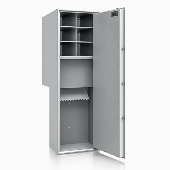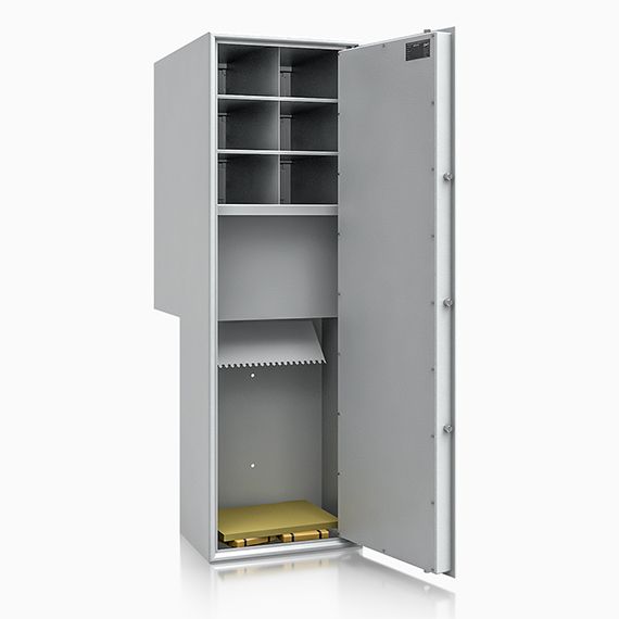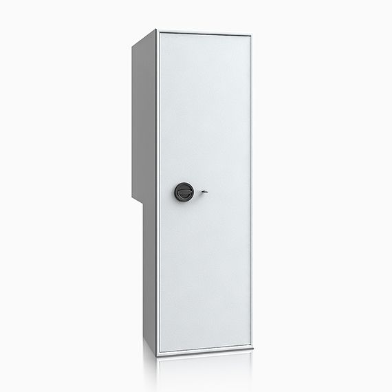 - Im Innengebäude wird ein Auffangtresor an der Außenwand installiert. Dieser Safe ist mit einem aufgesetzten Einwurfsystem und einem Annahme- und Ausgabe-Fach ausgestattet. Einwurf- und Ausgabesystem stehen zur Rückseite des Safes über und werden in die Wandöffnung eingemauert. Der Schacht der von außen zugänglichen Einwurfklappe wird über ein Doppelbartsicherheitsschloss (2 Schlüssel) gesperrt (ohne DB-Schloss nur bauartähnlich S 1) und die Tür des Ausgabe- und Annahmefaches ist mit einem Hochsicherheits-Elektronikschloss ausgestattet. Davor befindet sich noch eine zusätzliche Tür aus Edelstahl die Einwurfklappe und Annahme- und Ausgabe-Fach abdeckt (1. aus Witterungsgründen, da Edelstahl nicht rostet und 2. aus Sicherheitsgründen um Vandalismus usw. zu vermeiden). Diese Abdecktür ist standardmäßig mit einem Haltemagnet ausgestattet und kann gegen Aufpreis mit einem Kofferzahlenschloss ausgerüstet werden. Die Haupttür ist serienmäßig mit einem Doppelbart-Sicherheitsschloss (2 Schlüssel) ausgestattet.